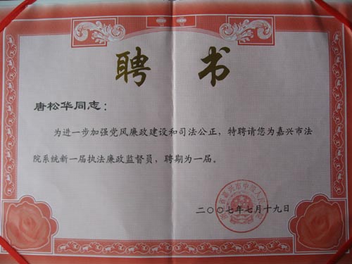 2007年7月19日,嘉興市中級人民法院聘請我所唐華律師為嘉興市法院系統(tǒng)執(zhí)法廉政監(jiān)督員。