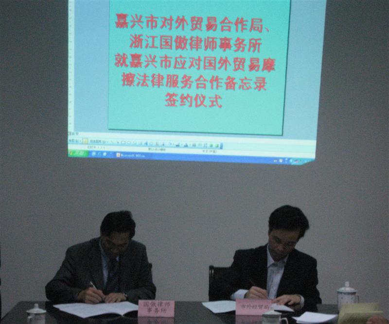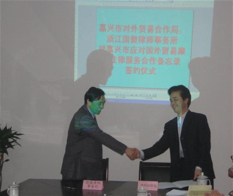 2009年4月10日,我所與嘉興市外經(jīng)貿(mào)局簽訂了《就嘉興市應對國外貿(mào)易摩擦法律服務合作備忘錄》,我所將協(xié)助市外經(jīng)貿(mào)局提供應對貿(mào)易摩擦的法律咨詢、應訴、抗辯等服務。