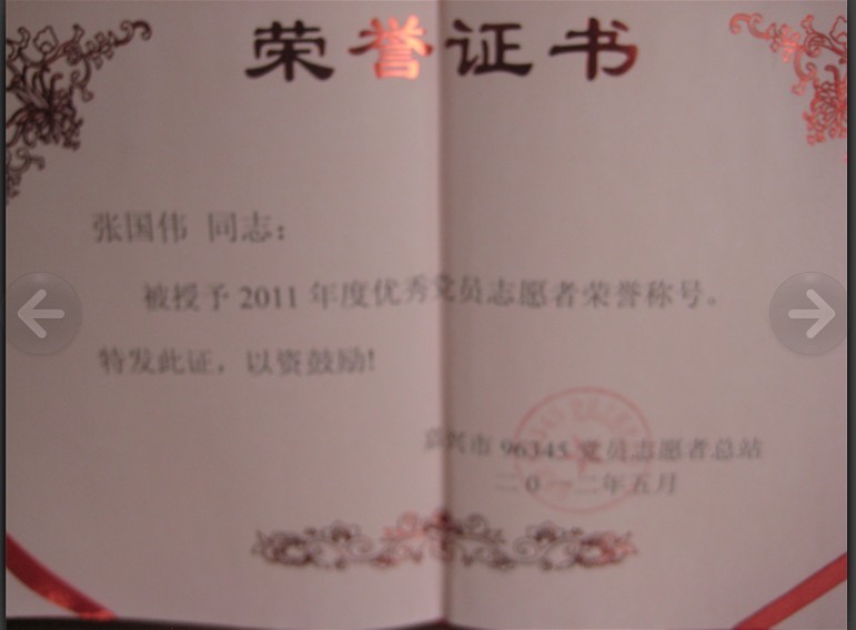 我所張國偉律師被嘉興市96345黨員志愿者總站授予“2011年度優(yōu)秀黨員志愿者”榮譽(yù)稱號!