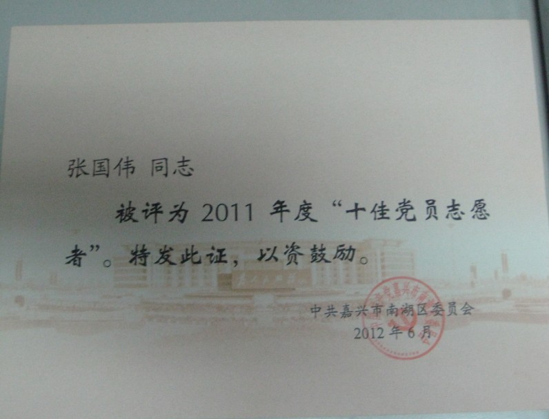 2012年6月,我所張國(guó)偉律師被嘉興市南湖區(qū)委員會(huì)評(píng)為2011年度“十佳黨員志愿者”。