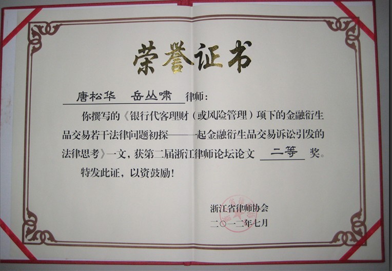 我所岳叢嘯律師參加了此次活動,同時,唐松華、岳叢嘯律師撰寫的《銀行代客理財(或風(fēng)險管理)項下的金融衍生品交易若干法律問題初探——一起金融衍生品交易訴訟引發(fā)的法律思考》一文,榮獲第二屆浙江省律師論壇論文二等獎!