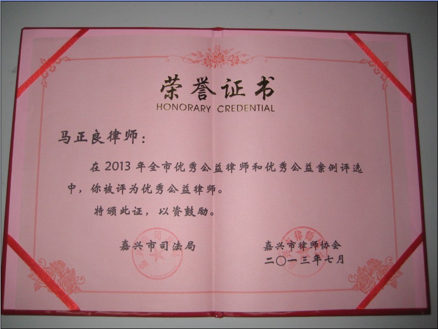 2013年7月,我所馬正良律師在2013年度全市優(yōu)秀公益律師和優(yōu)秀公益案例評(píng)選中,被嘉興市司法局、嘉興市律師協(xié)會(huì)評(píng)為“優(yōu)秀公益律師”。