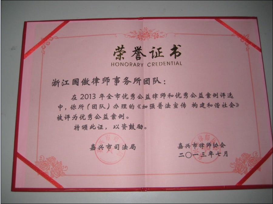 2013年7月,我所律師團(tuán)隊(duì)辦理的《加強(qiáng)普法宣傳 構(gòu)建和諧社會(huì)》在2013年全市優(yōu)秀公益律師和優(yōu)秀公益案例評(píng)選中,被嘉興市司法局、嘉興市律師協(xié)會(huì)評(píng)為“優(yōu)秀公益案例”。