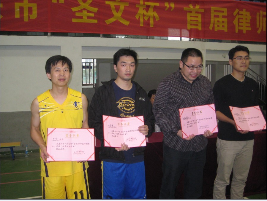 下圖為我所周沈鋒律師(左二)作為我所籃球隊代表接受冠軍獎杯頒獎: