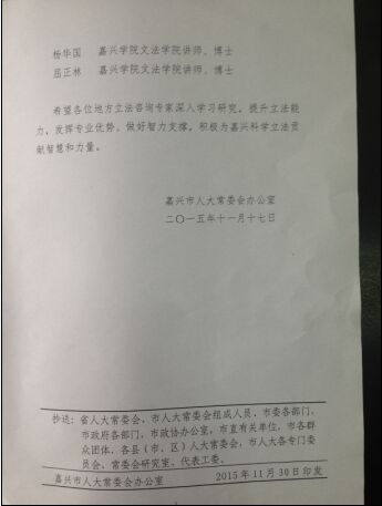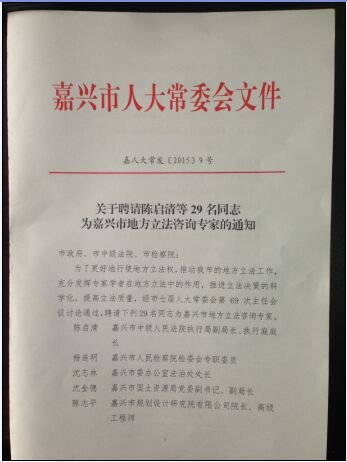 經(jīng)嘉興市第七屆人大常委會第69次主任會議討論通過,我所馬正良主任被聘為嘉興市地方立法咨詢專家,目的是為了更好地行使地方立法權(quán),推動嘉興市的地方立法工作,充分發(fā)揮專家學(xué)者在地方立法中的作用,推進(jìn)立法決策的科學(xué)化,提高立法質(zhì)量。