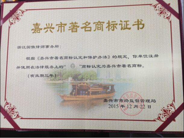 2015年,為進(jìn)一步提升品牌價(jià)值,浙江國(guó)傲律師事務(wù)所申報(bào)了嘉興市著名商標(biāo),雖然《嘉興市著名商標(biāo)認(rèn)定條件的具體標(biāo)準(zhǔn)》當(dāng)中設(shè)置了許多苛刻的條件,比如:“商標(biāo)所指商品/服務(wù)的質(zhì)量應(yīng)在同類商品/服務(wù)中名列前茅,信譽(yù)度高,市場(chǎng)前景良好”、“商標(biāo)所指商品/服務(wù)的銷售額、利潤(rùn)、稅金等主要經(jīng)濟(jì)指標(biāo)和企業(yè)規(guī)模在全市同行業(yè)中名列前茅,企業(yè)有較好的經(jīng)濟(jì)效益和社會(huì)效益,并具有良好的發(fā)展前景”、“服務(wù)業(yè)年度創(chuàng)收額在1000萬以上”、“商標(biāo)所指商品/服務(wù)的市場(chǎng)覆蓋面和占有率在市內(nèi)同行業(yè)中位居前列,應(yīng)基本覆蓋全市或輻射不少于兩個(gè)以上的外省、市市場(chǎng)”、“主要銷售/服務(wù)地對(duì)該商標(biāo)的認(rèn)知度應(yīng)達(dá)到熟知程度”等等,但國(guó)傲所對(duì)此充滿自信,相信自己完全符合各項(xiàng)條件,而評(píng)選認(rèn)定結(jié)果也正如預(yù)期的一樣,浙江國(guó)傲律師事務(wù)所一次性通過了嘉興市著名商標(biāo)的認(rèn)定。