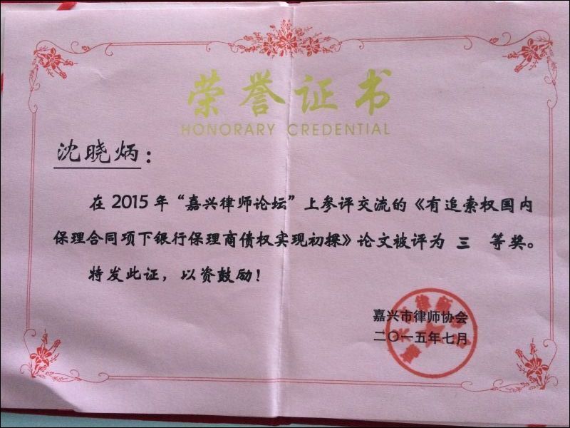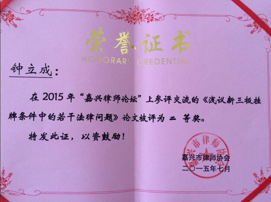 會(huì)上,我所唐松華副主任被嘉興市律師協(xié)會(huì)聘為“嘉興市律師協(xié)會(huì)公職律師專門委員會(huì)主任”。此外,大會(huì)研討采取“作者演講—與會(huì)者提問和作者答辯—評(píng)委點(diǎn)評(píng)”的方式,重點(diǎn)針對(duì)突破企業(yè)“新三板”掛牌的困境、“互聯(lián)網(wǎng)+時(shí)代”律師服務(wù)行動(dòng)計(jì)劃等新興課題進(jìn)行理論與實(shí)務(wù)研討交流,經(jīng)專業(yè)評(píng)委和大眾評(píng)委民主投票,我所潘玲源律師論文《律師服務(wù)的“互聯(lián)網(wǎng)+”行動(dòng)計(jì)劃——以中小規(guī)模律師事務(wù)所建立律師服務(wù)電子商務(wù)為視角》、鐘立成律師論文《淺議新三板掛牌條件中的若干法律問題》獲二等獎(jiǎng),沈曉炳律師論文《有追索權(quán)國(guó)內(nèi)保理合同項(xiàng)下銀行保理商債權(quán)實(shí)現(xiàn)初探》獲三等獎(jiǎng)。