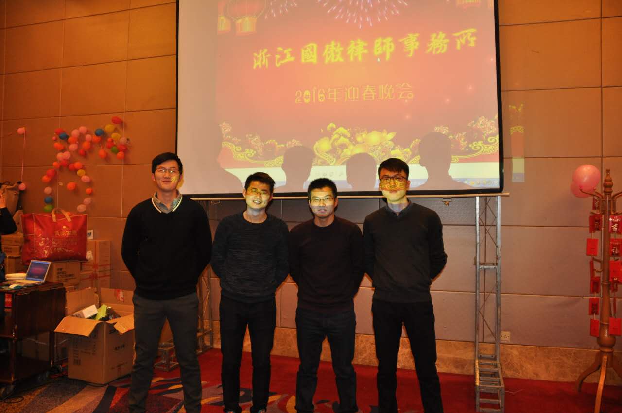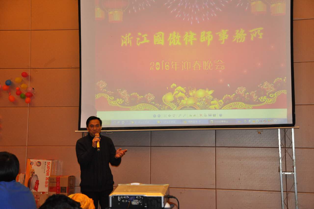 本次晚會由我所周沈鋒律師主持,晚會共分視頻回顧、表彰、歌唱、游戲、抽獎五大部分。晚會第一部分是通過視頻的形式回顧了我所工作人員在2015年一年的工作軌跡,包括在遠(yuǎn)赴俄羅斯提供法律服務(wù)、為顧問單位授課、參加省市各項培訓(xùn)、參加96345黨員志愿者活動等,同時展示了我所和我所工作人員在2015年獲得的諸多榮譽,尤其需要說明的是我所“GA”商標(biāo)被評為嘉興市著名商標(biāo),著名商標(biāo)的評定條件苛刻,但我所依舊憑借自身強大的實力,一次性通過了嘉興市著名商標(biāo)的認(rèn)定。