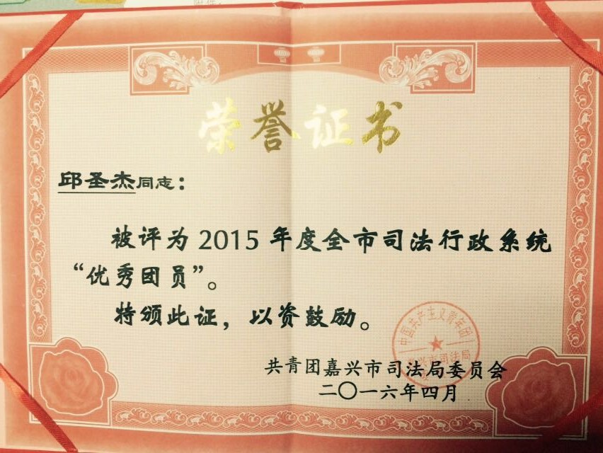 我所邱圣杰律師被共青團(tuán)嘉興市司法局委員會評為2015年度全市司法行政系統(tǒng)“優(yōu)秀團(tuán)員”。