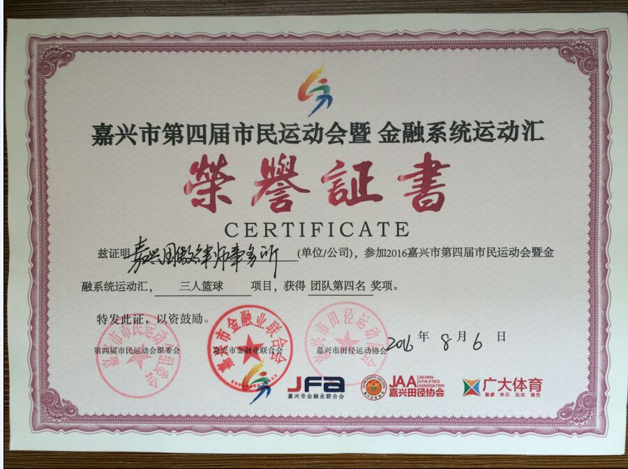 最終,我所籃球代表隊(duì)獲得第四名的好成績,能在32支隊(duì)伍中取得如此好的成績實(shí)屬不易,后嘉興市金融業(yè)聯(lián)合會秘書長周永新和嘉興市田徑運(yùn)動協(xié)會秘書長曹建平為我所籃球隊(duì)頒發(fā)了團(tuán)體獎狀。