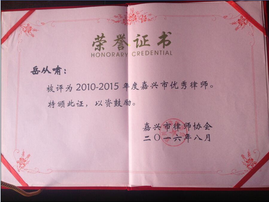 會議同時表彰了2010—2015年度的嘉興市優(yōu)秀律師,我所岳叢嘯律師被嘉興市律師協(xié)會評為“2010—2015年度嘉興市優(yōu)秀律師”。