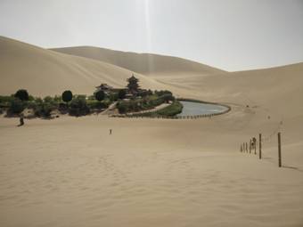 鳴沙山讓我們近距離接觸到了沙漠,雖然是景點,但是完全可以體會“沙漠孤煙”。在這里,我們看到了沙漠出泉水、沙隨風動、沙飄發(fā)聲等等神奇的自然景象。烈日當空炙烤著身體,深一腳淺一腳在沙中行進,體力大量流失,需要不停地喝水,此時正能體會水在沙漠中的珍貴。而靠著巨大的毅力,花完絕大部分體力,爬上一個沙坡后,舉目四望,周圍全是一個個沙坡頭,此時才能體會人在荒漠中的恐懼和絕望。