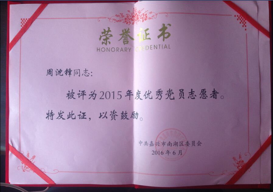 我所周沈鋒律師被中共嘉興市南湖區(qū)委員會(huì)評(píng)為“2015年度優(yōu)秀黨員志愿者”榮譽(yù)稱(chēng)號(hào)。