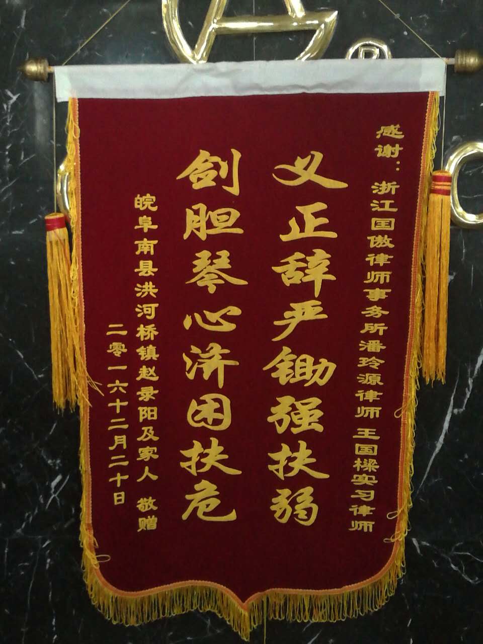 我所潘玲源律師、王國樑實(shí)習(xí)律師積極誠懇的工作態(tài)度態(tài)度和專業(yè)的法律服務(wù),得到了當(dāng)事人肯定,特送來錦旗,對我所律師的辛苦勤工作表示感謝。