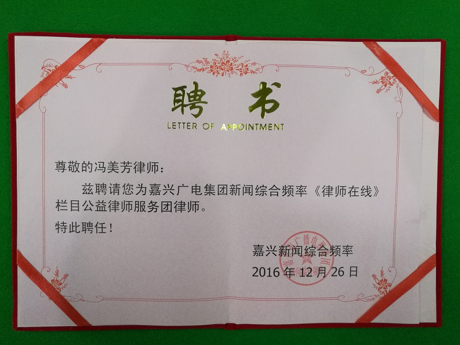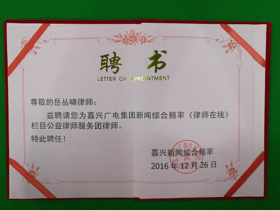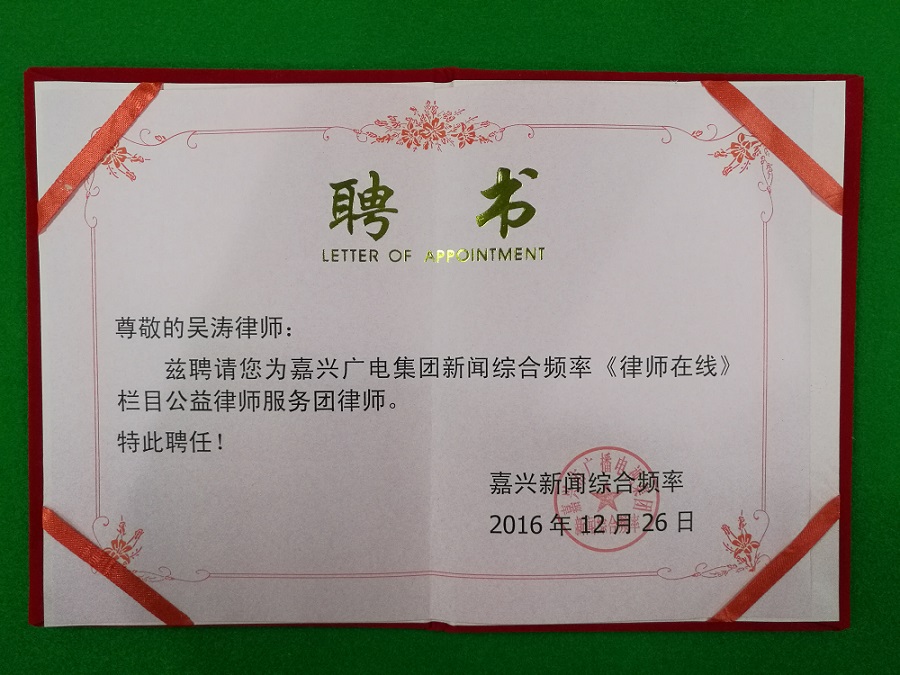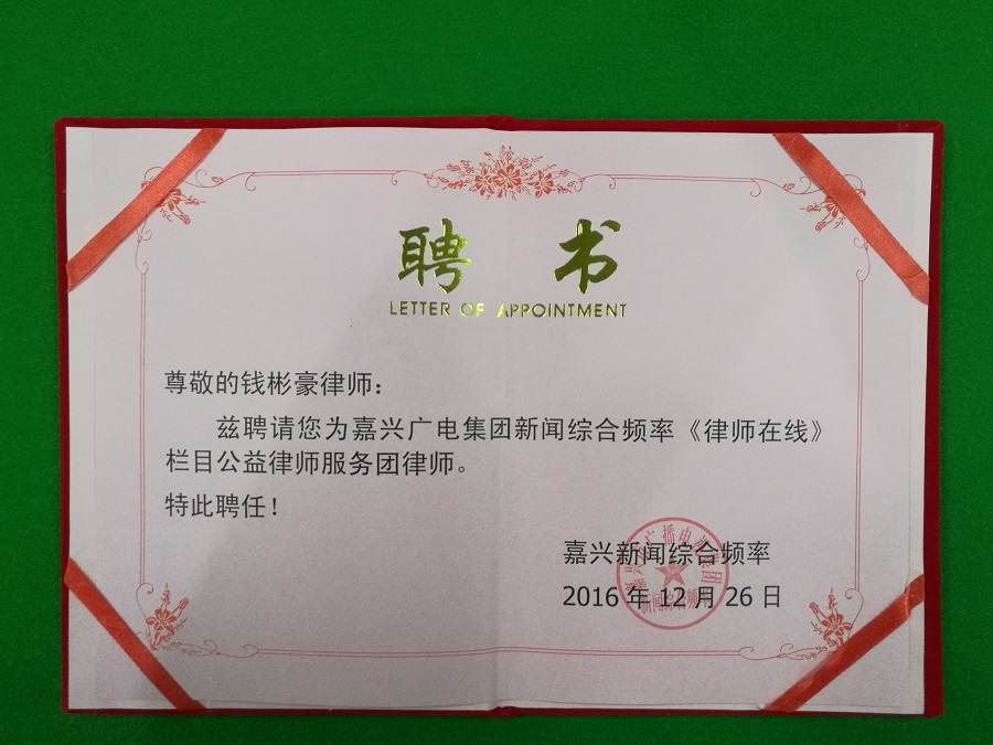 我所吳濤、錢彬豪、岳叢嘯、馮美芳律師被嘉興廣電集團(tuán)新聞綜合頻率《律師在線》欄目聘為公益律師服務(wù)團(tuán)律師。