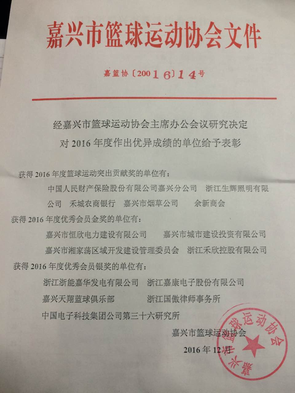嘉興市籃球運動協(xié)會授予我所“2016年度優(yōu)秀會員銀獎”的榮譽稱號,是對我所籃球隊長期以來積極參加籃球活動的認(rèn)可和肯定,我所籃球隊一定會珍惜這來之不易的榮譽,再接再厲,將律師籃球、快樂籃球、開心籃球的理念延續(xù)下去。