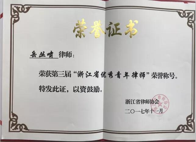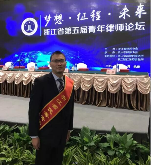 2017年11月4日,浙江省第五屆青年律師論壇在杭州舉辦。我所合伙人岳叢嘯律師獲得“浙江省優(yōu)秀青年律師”稱號,并接受頒獎。
